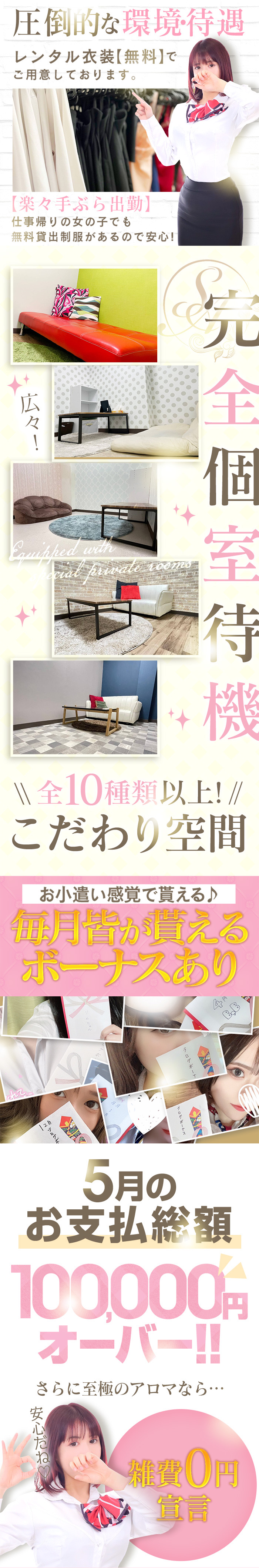バック料金 70分10000円 100分14000円 130分18000円 160分22000円 190分26000円 完全日払い 完全鍵付き個室 送迎付き Wi-Fi完備 メイクルーム完備 制服・お仕事道具貸出