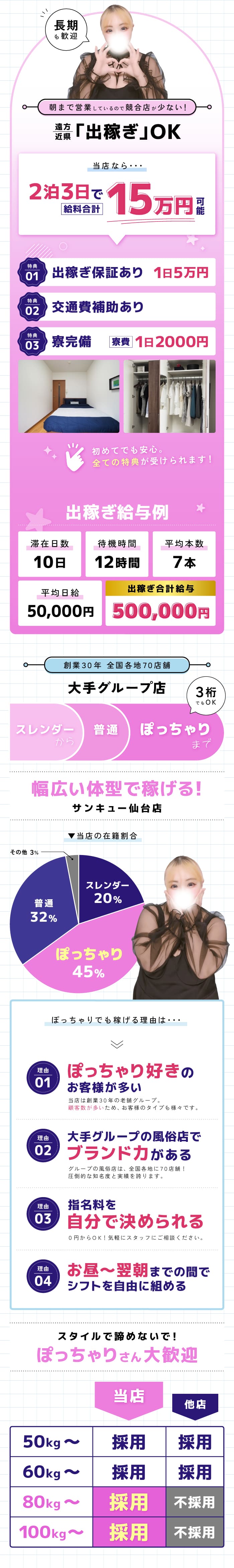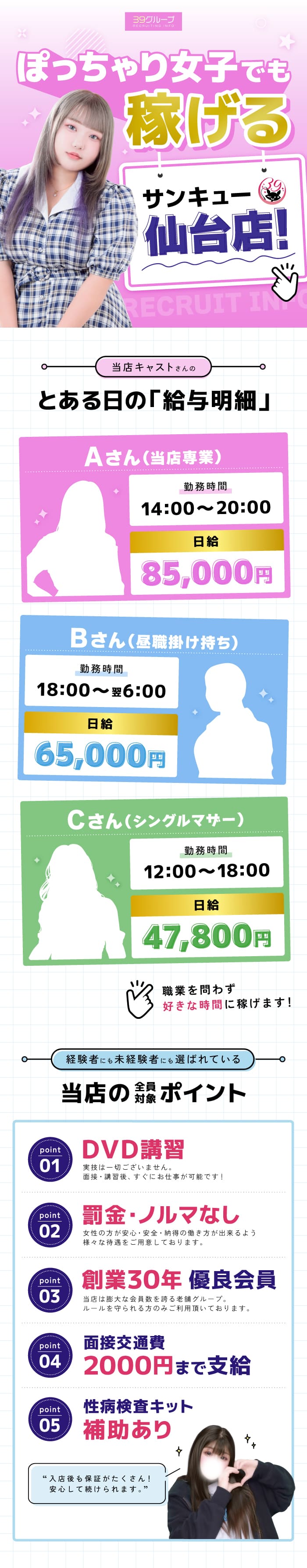 どの時間帯でも稼げる環境は整ってます♪ そして採用率は驚異の99%over! 18歳以上の方なら年齢・経験一切関係なし! 24時間いつでも面接承ります♪ 【お給料モデル】 Aちゃん(普通体型でオプション少なめ) 月10日8~12時間で出勤 25本(指名数15本+フリー5本)204,000円 Bちゃん(ぽっちゃり体型でオプション多め) 月16日8~12時間で出勤 39本(指名数36本+フリー3本)296,000円 Cちゃん(プレミア+2000円でオプションが一般的) 月20日8~12時間で出勤 61本(指名数48本+フリー13本)617,200円 頑張り次第で100万オーバーも夢ではありません! 【勤務時間】 完全自由出勤!女の子のスケジュール優先でシフトを組んでいきます! 緊急出勤OK! 週1、月1、年1の出勤でも全然問題ありません! 本業が忙しい方も隙間時間で勤務時間が選べます! しっかりまとまったお金を稼ぎたい方も大歓迎! 掛け持ち希望の方大歓迎♪ また、今までに稼げなかった方、自分自身に自信のない方でもお任せください。 当店の全スタッフが一丸となって完全アシストし、不安なことや女性特有の悩みなど相談できる環境が整っています。